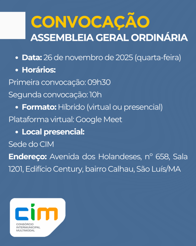 O PRESIDENTE DO CONSÓRCIO INTERMUNICIPAL MULTIMODAL – CIM, Senhor JOSE FRANCINETE BENTO LUNA, no uso das atribuições que lhes são conferidas pelo inciso II, do art. 4º do Estatuto Social do CIM e demais dispositivos legais de regência, CONVOCA todos os Representantes dos municípios de: AÇAILÂNDIA, ANAJATUBA, ALTO ALEGRE DO PINDARÉ, ARARI, BACABEIRA, BELA VISTA DO MARANHÃO, BOM JARDIM, BOM JESUS DAS SELVAS, BOM JESUS DO TOCANTINS/PA, BURITICUPU, CIDELÂNDIA, IGARAPÉ DO MEIO, ITAPECURU MIRIM, ITINGA DO MARANHÃO, MONÇÃO, MIRANDA DO NORTE, PARAUAPEBAS/PA, PINDARÉ MIRIM, SANTA INÊS, SÃO LUÍS, SANTA LUZIA, SANTA RITA, SÃO FRANCISCO DO BREJÃO, SÃO PEDRO DA ÁGUA BRANCA, TUFILÂNDIA, VILA NOVA DOS MARTÍRIOS E VITÓRIA DO MEARIM, membros do Consórcio Intermunicipal Multimodal – CIM, para participarem da ASSEMBLEIA GERAL ORDINÁRIA, a ser realizada no dia 26/11/2025 (Quarta-feira), sendo a primeira convocação às 09:30h e segunda convocação às 10:00h, por meio virtual (Google Meet) ou presencial na sede do CIM, localizado na Avenida dos Holandeses, nº 658, Sala 1201, Ed. Century, Calhau, São Luís/MA, com a seguinte ordem do dia: